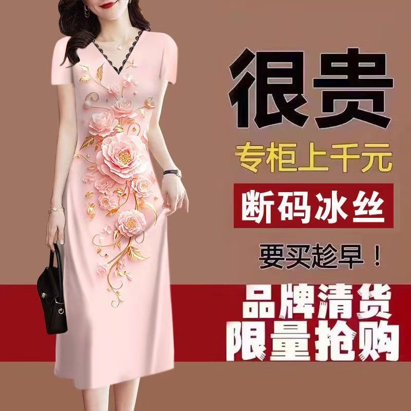 清仓捡漏~断码中年民族风蕾丝女装夏季新款洋气印花v领修身连衣裙