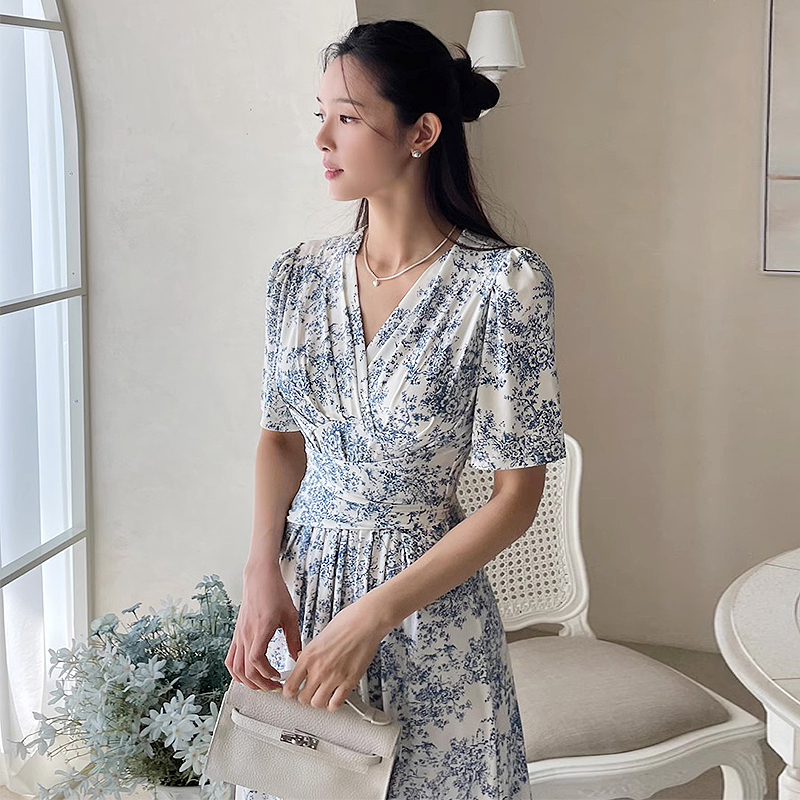 法式气质短袖连衣裙女夏季民族风青花水墨印花系带收腰显瘦长裙子