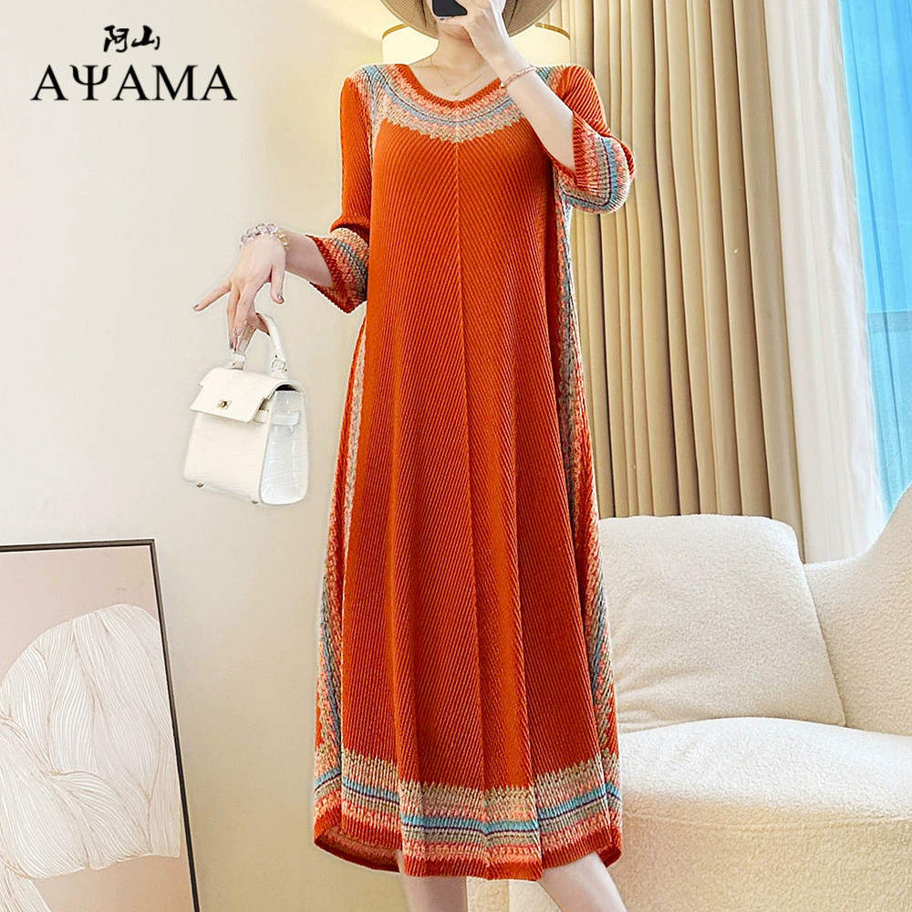 高端大码民族风褶皱连衣裙秋2025新款洋气妈妈宽松过膝遮肚A字裙