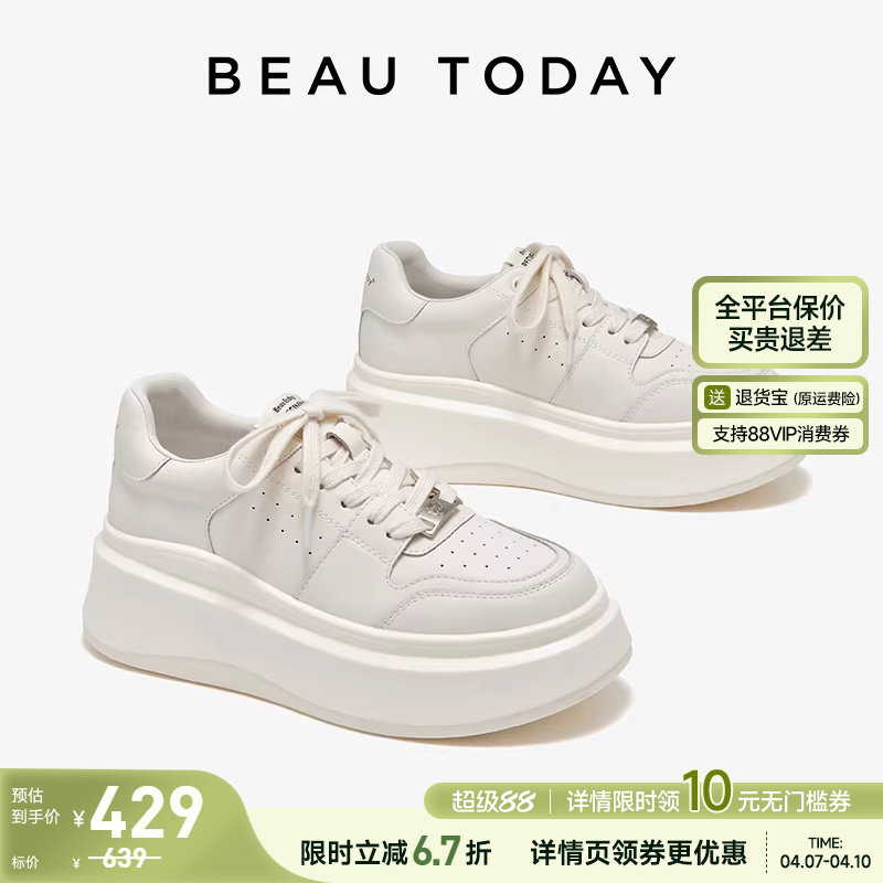 BeauToday厚底小白鞋女内增高单鞋春季休闲鞋白色板鞋女款老爹鞋