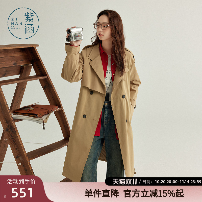 紫涵复古英伦风翻驳领风衣女春秋季新款经典中长款宽松插肩袖外套