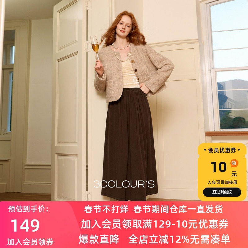 三彩2025冬季新款简约高腰针织半身裙A字裙复古伞裙长裙垂感气质S