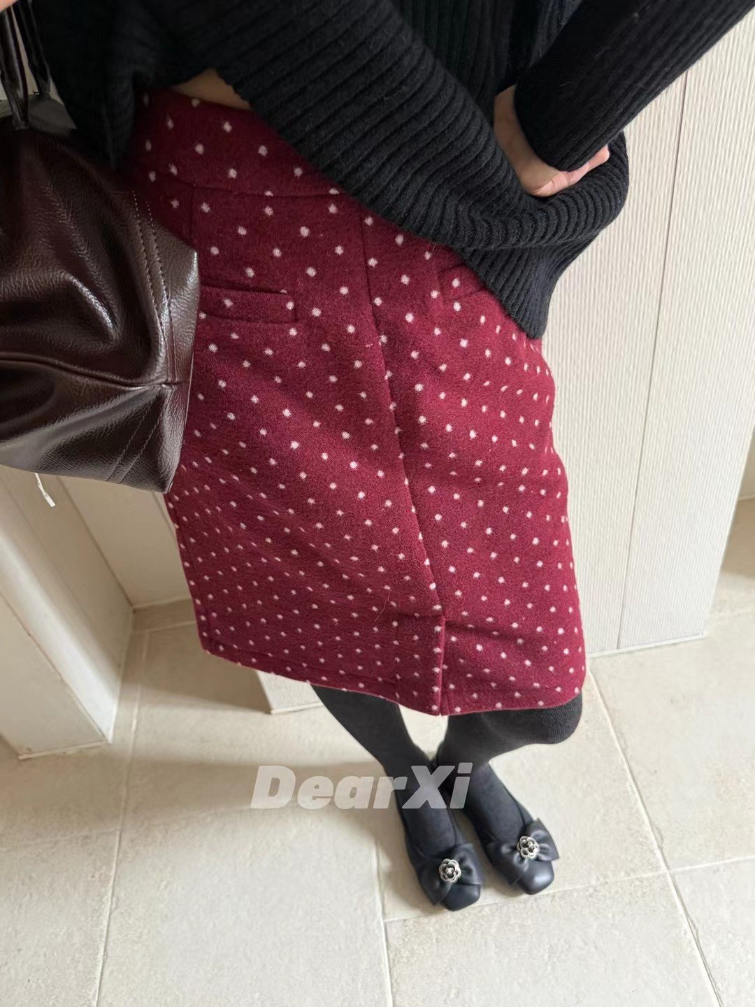 日了个韩|宽松复古高腰显瘦加厚保暖前开叉波点呢子半身裙A字裙