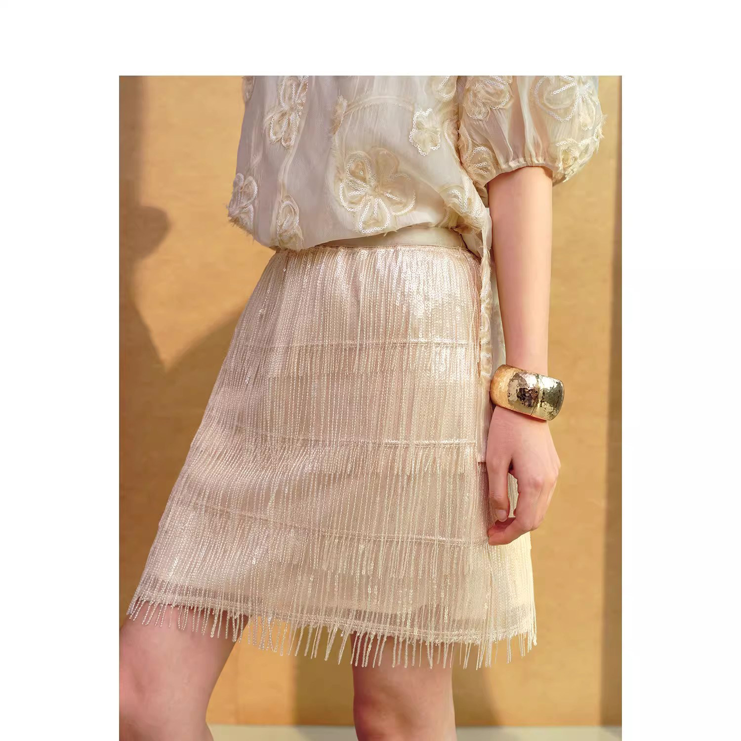 爵莱菲大码胖mm新款薄款纯色亮片流苏半身裙A字裙修身短裙女夏