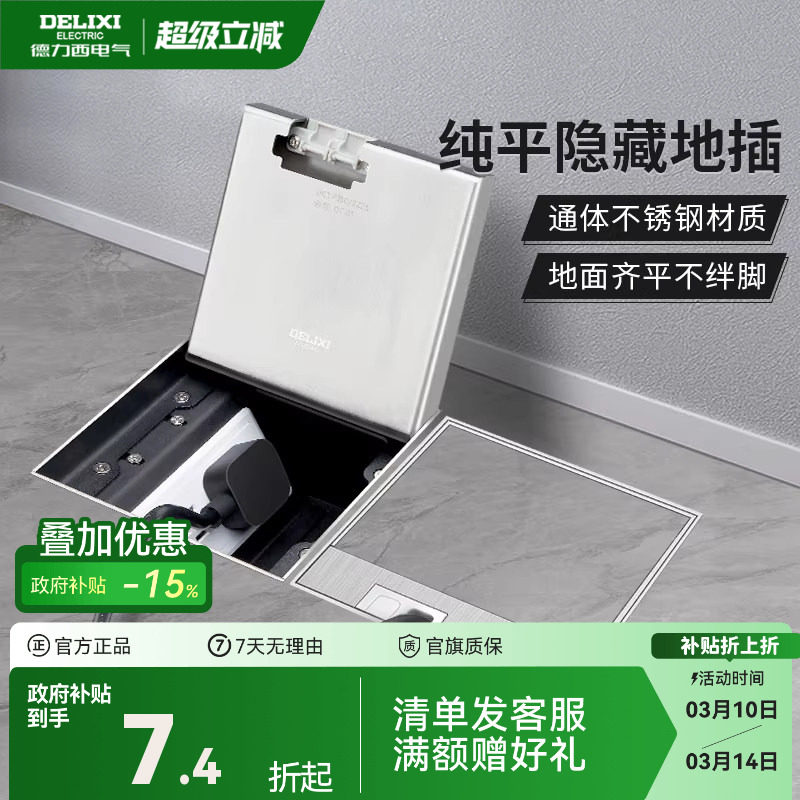 德力西嵌入式地插座隐形不锈钢纯平暗藏暗埋超薄隐藏式防水地面插