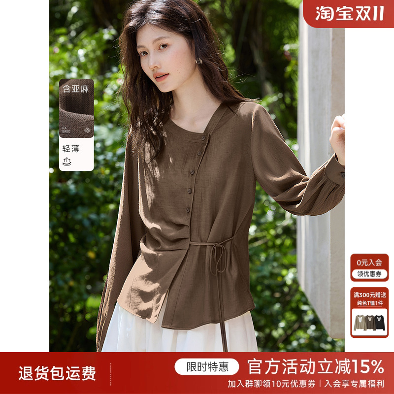 XWI欣未含亚麻美拉德长袖肌理感衬衫女秋季新款系带遮肉显瘦上衣