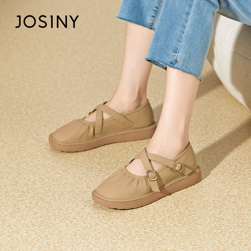 - 真皮圆头平跟单鞋女
