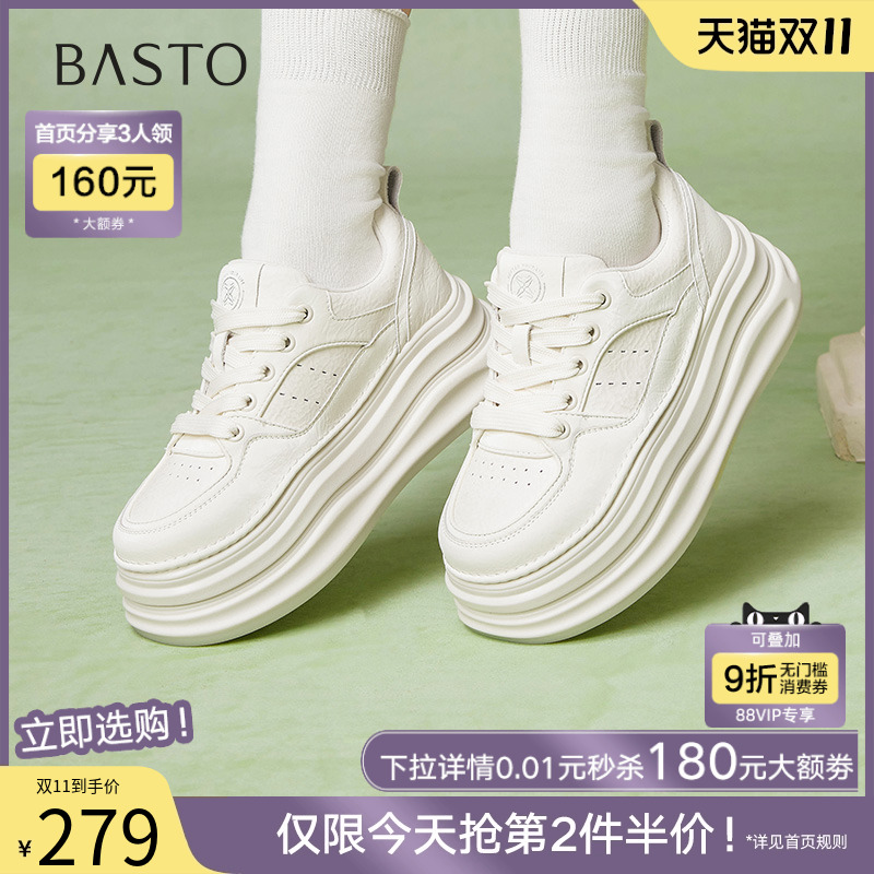 百思图25秋商场新款牛皮透气松糕厚底板鞋小白鞋女休闲鞋USN05CM5