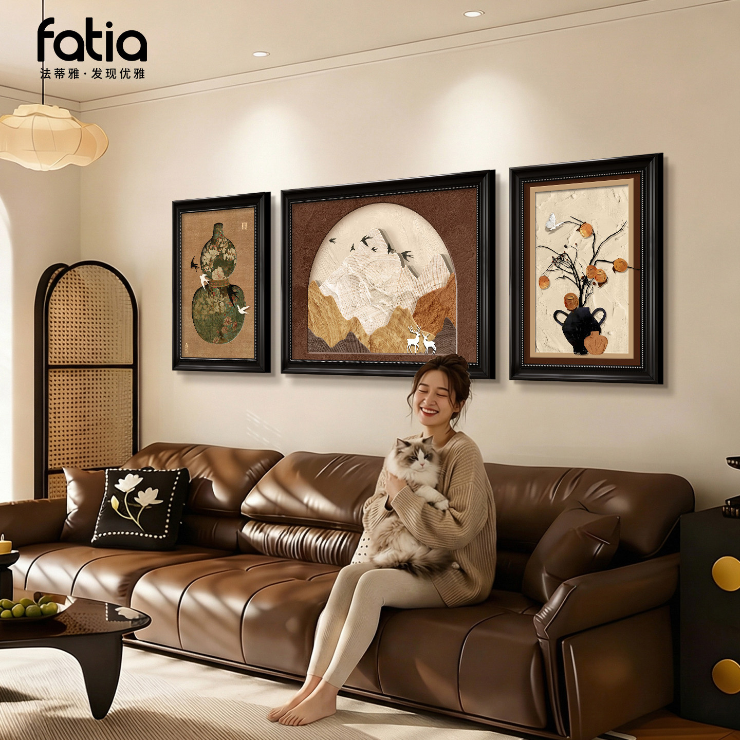 柿柿如意客厅装饰画背有靠山三联壁画中古风沙发背景墙挂画高级感