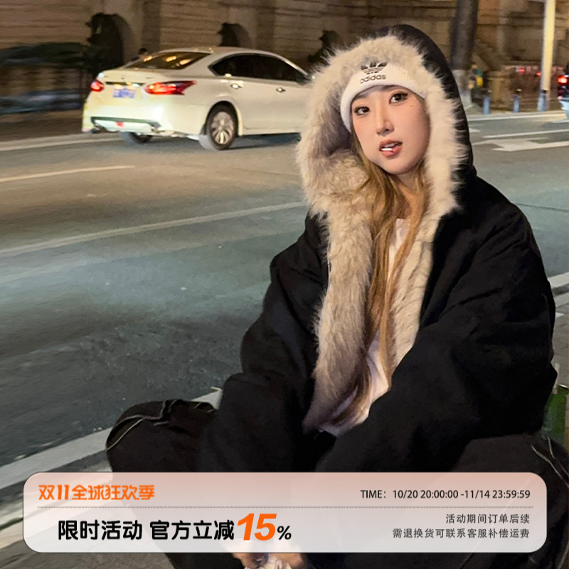 饭饭又饿了美式黑色毛领连帽棉衣棉服女冬季加绒保暖拉链夹克外套