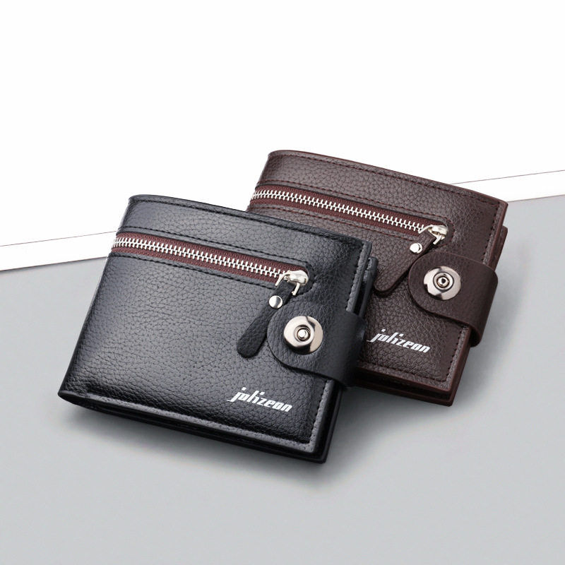 新品 磁扣钱包男士短款皮夹带拉链零钱袋男式钱夹折叠男款多卡位