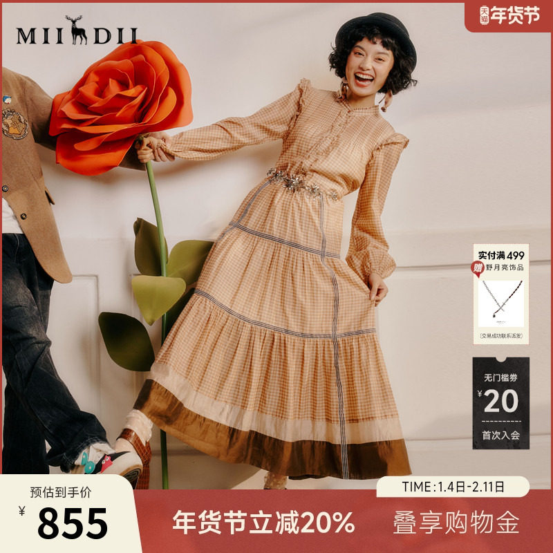 谜底两件式连衣裙长袖回归乡野复古文艺格子长裙配腰带241GL0112