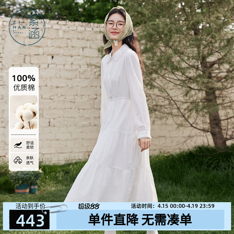 紫涵翻领长袖连衣裙女士秋季新款温柔文艺风收腰显瘦a字白色长裙
