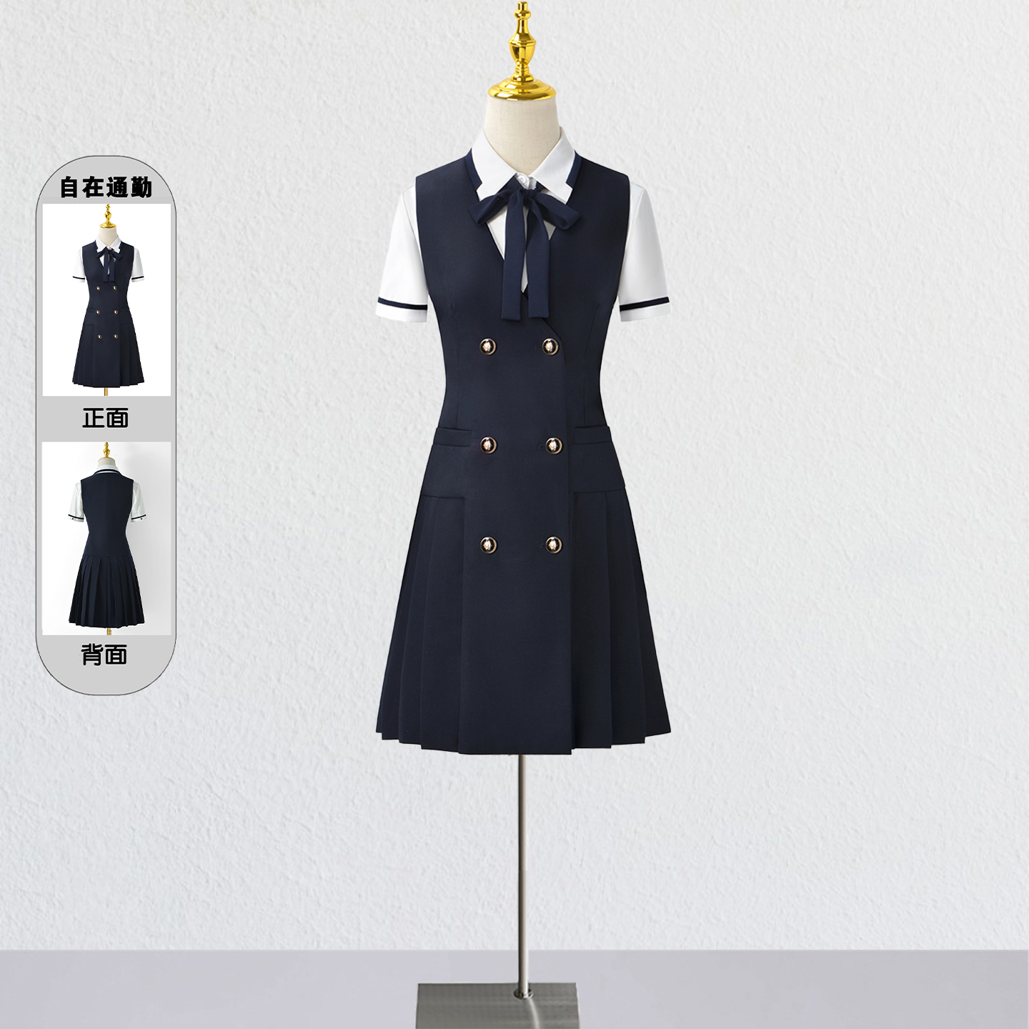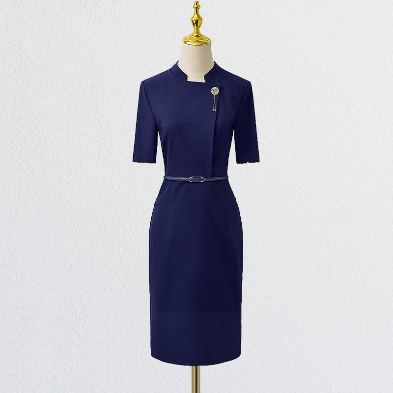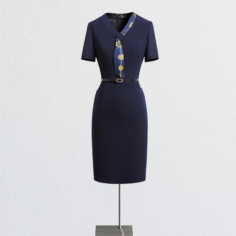 藏青色职业连衣裙夏款气质美容院珠宝店酒店物业工装前台工作服女