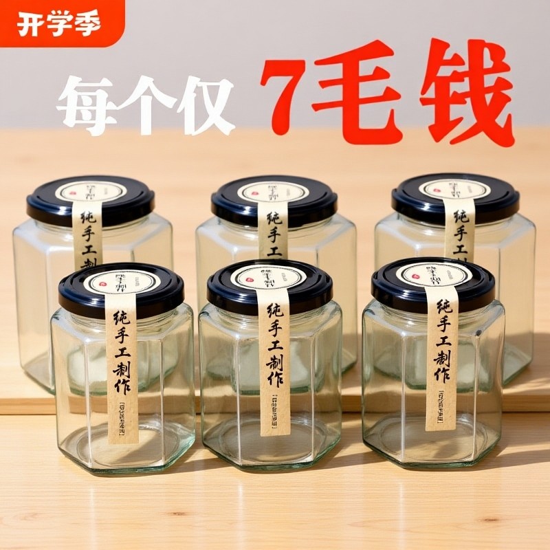 六棱玻璃罐密封食品级小带盖空柠檬膏蜂蜜辣椒果酱专用瓶子牛肉酱