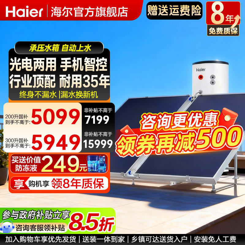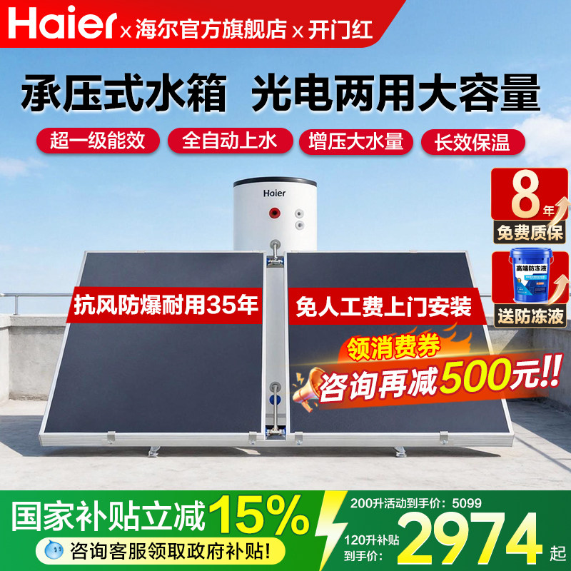 海尔太阳能热水器200L家用300升承压光电两用农村自建房承大容量