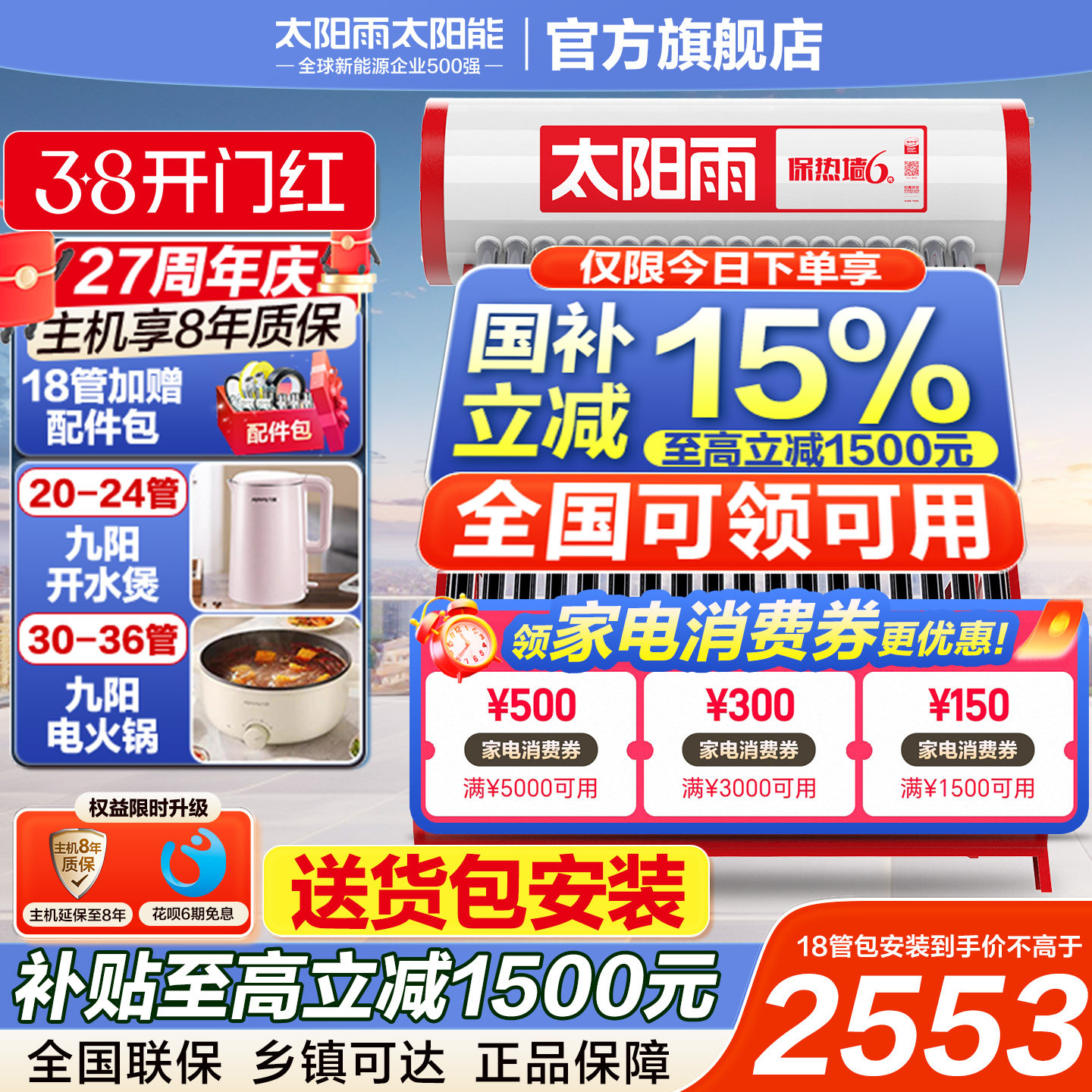 太阳雨太阳能热水器家用升级保热墙新型农村可选电加热全自动上水