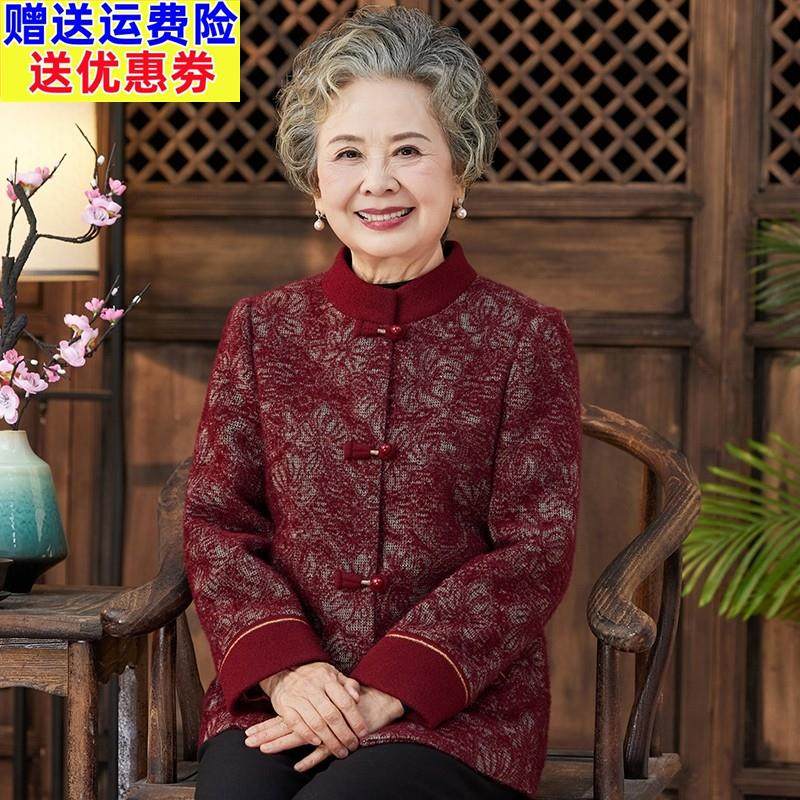 妈妈秋冬装针织毛衣外套中老年人女装唐装婆婆婚宴礼服加绒两件套