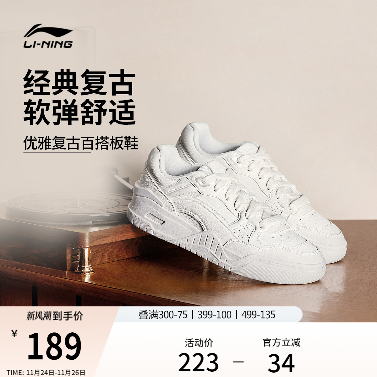 李宁月白2.0丨板鞋女小白鞋复古百搭休闲鞋舒适软弹情侣男运动鞋