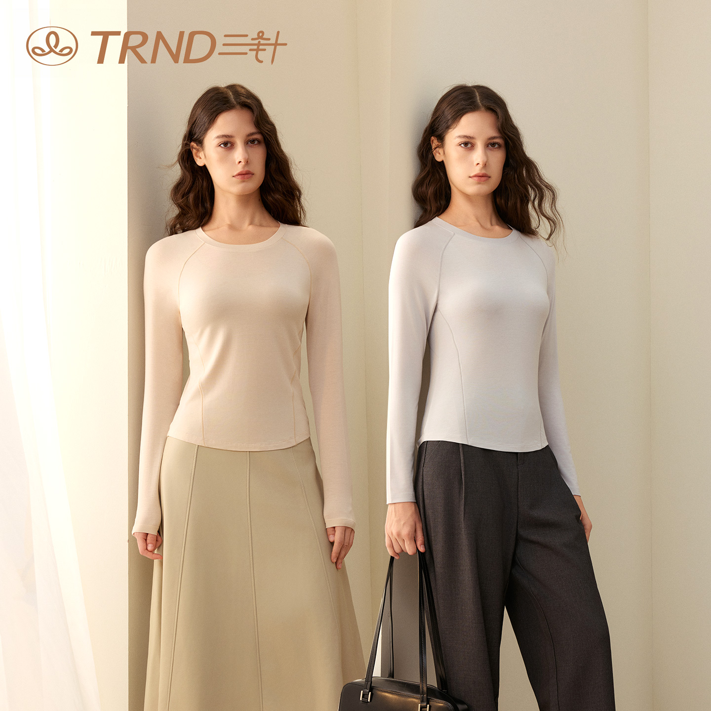 三针女士超薄保暖内衣女莫代尔美肤衣圆领拼色秋衣打底衫发热上衣