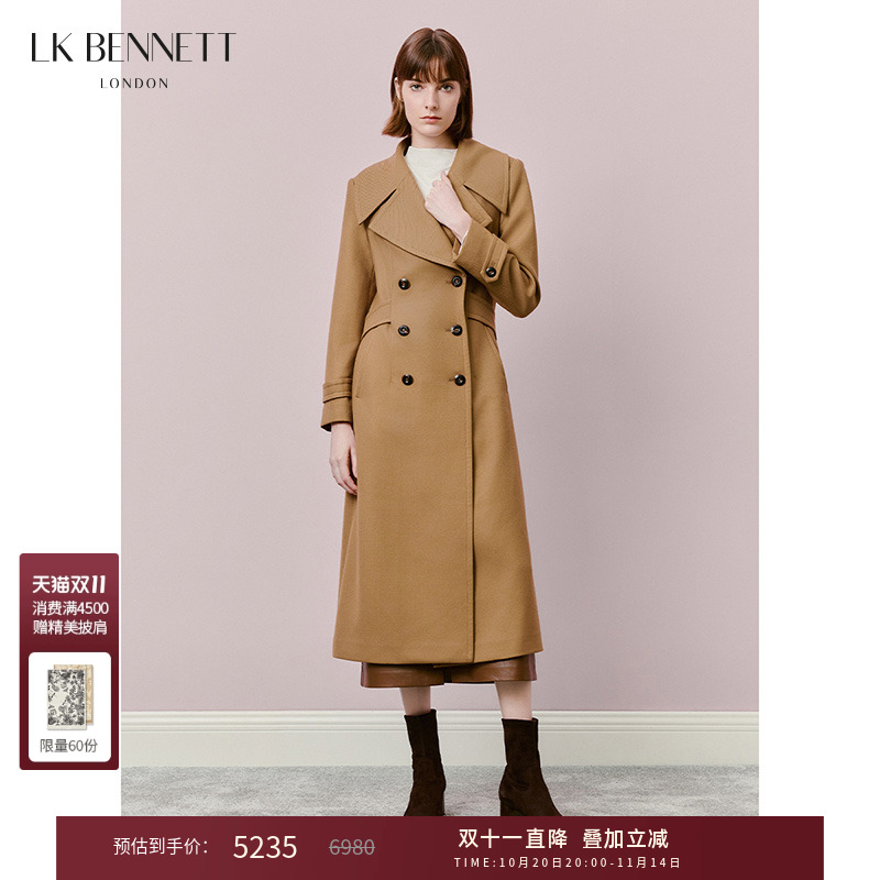 lkbennett驼色绵羊毛风衣外套女2025年冬新款新英伦系带长款