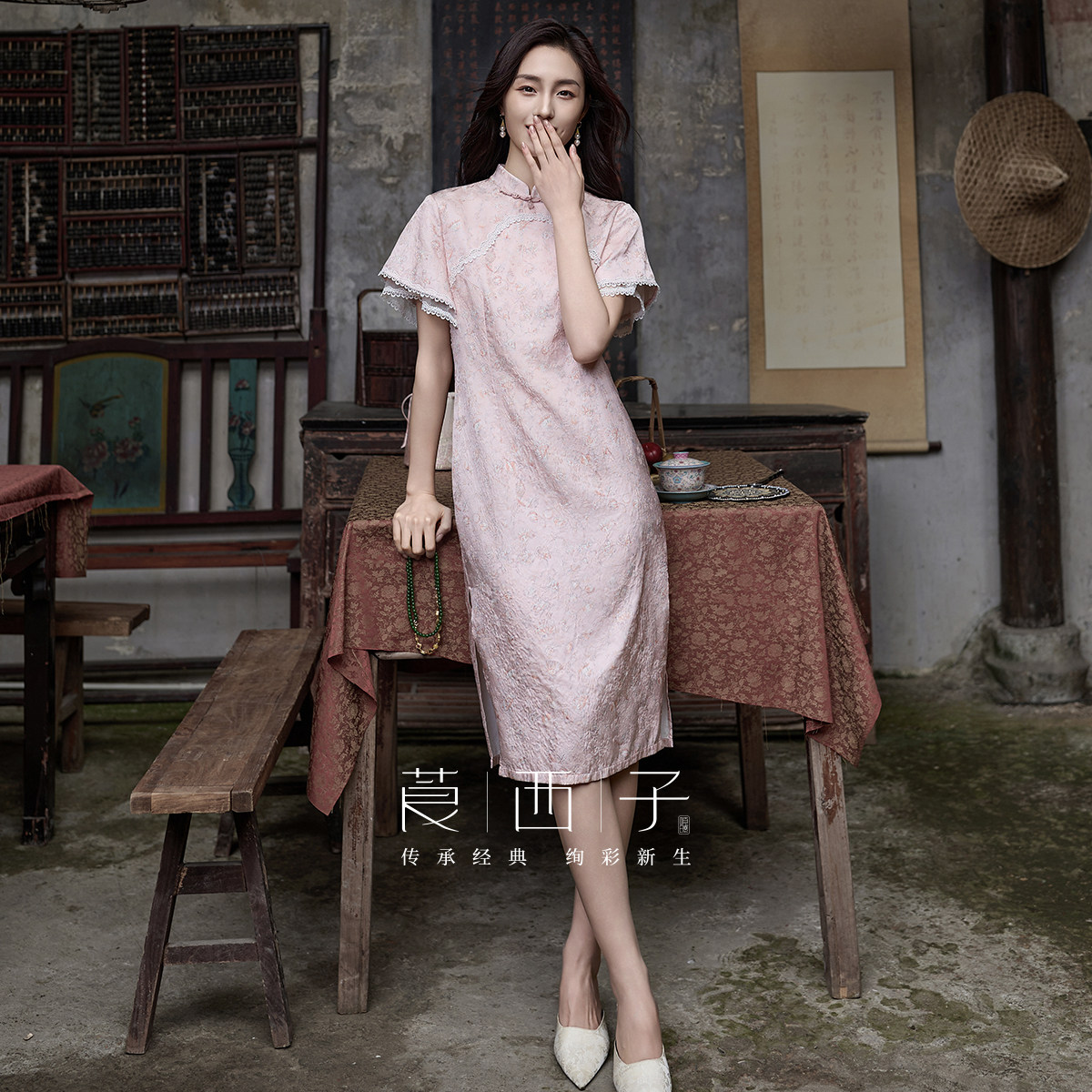 2026夏季新款复古民国风喇叭袖收腰开衩素雅天丝提花旗袍连衣裙