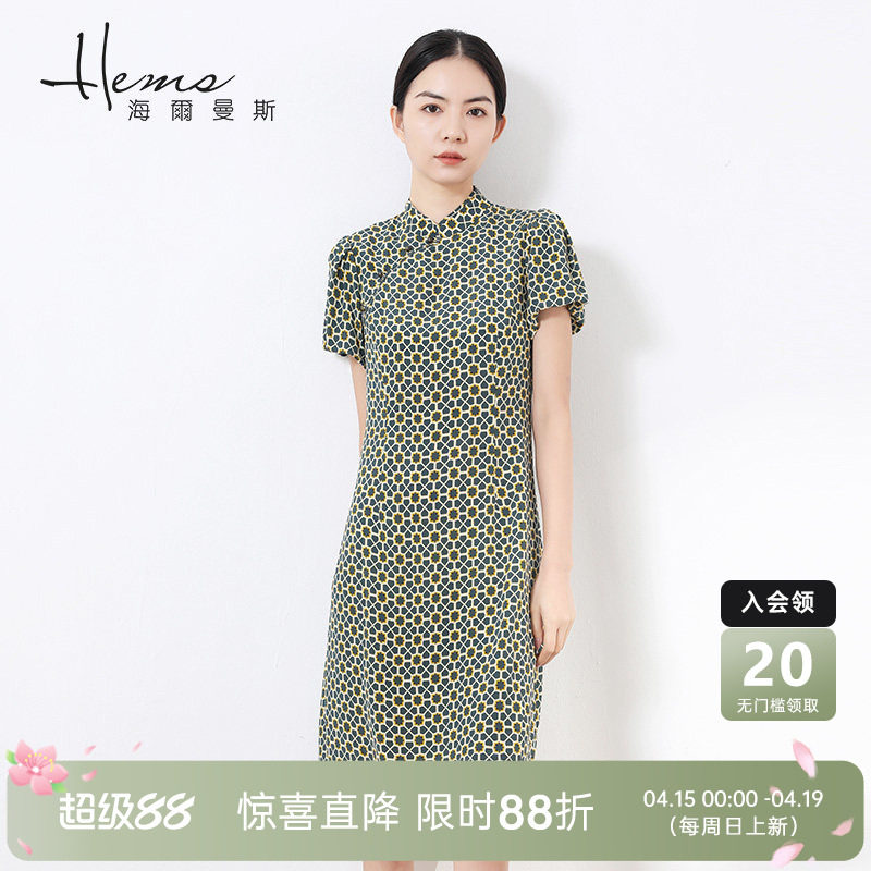 海尔曼斯复古旗袍风桑蚕丝真丝连衣裙法式修身气质女长裙22836C9Q