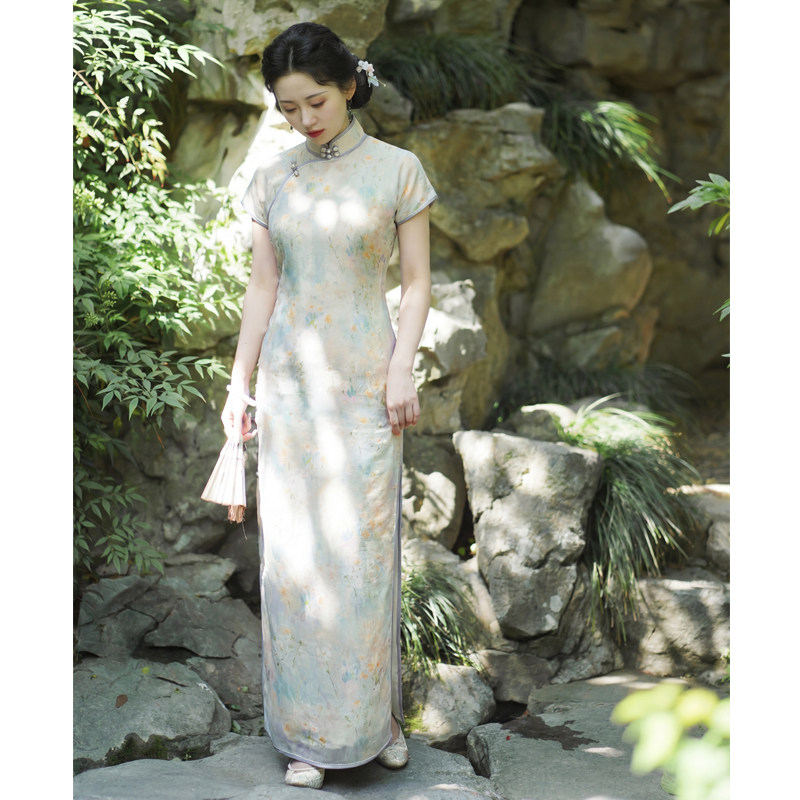 渔牌中国风女装2024新款春夏桑蚕真丝古典印花旗袍连衣裙FGGA0016