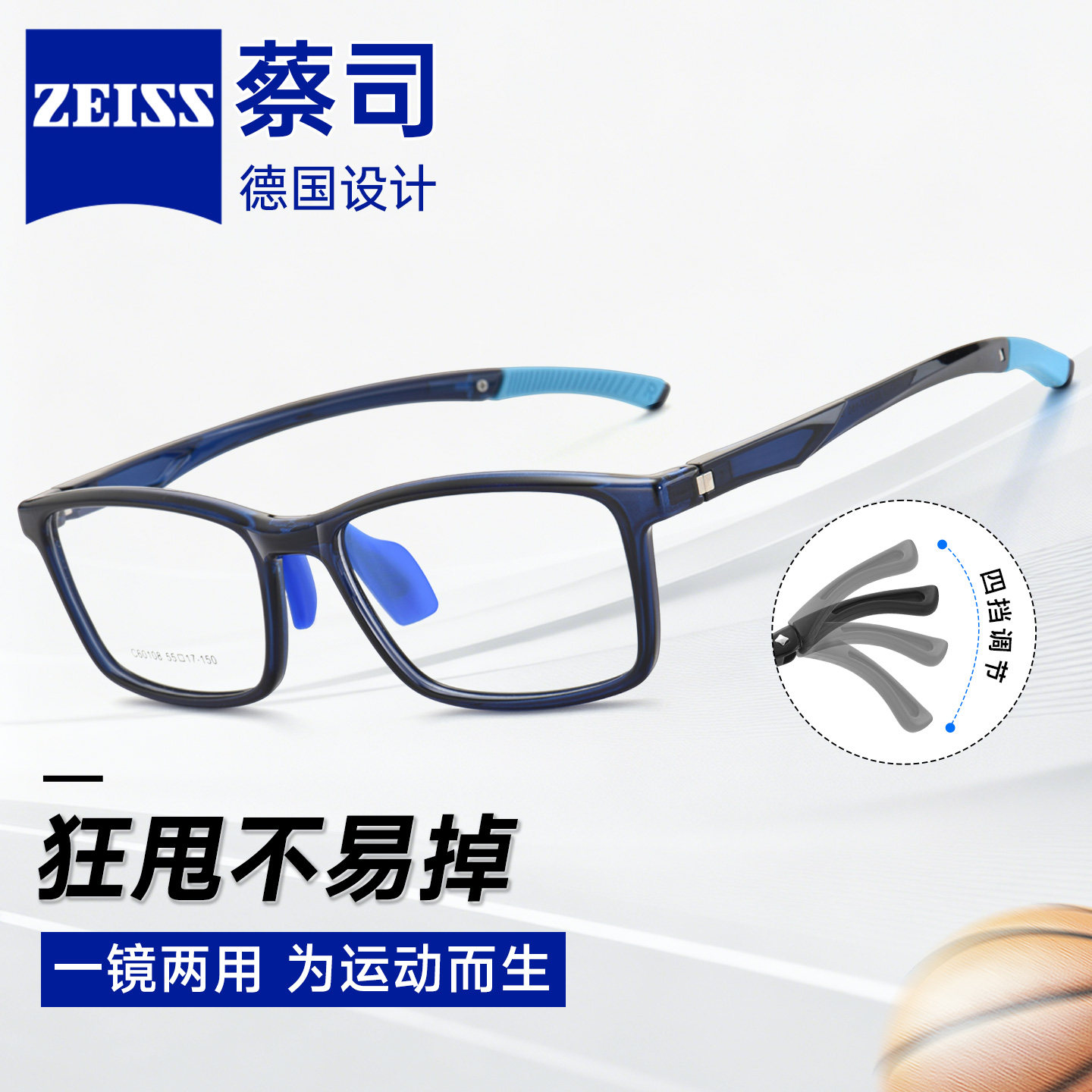 德国蔡司配大脸男士4档可调节运动眼镜框跑步防滑耐摔硅胶C60108