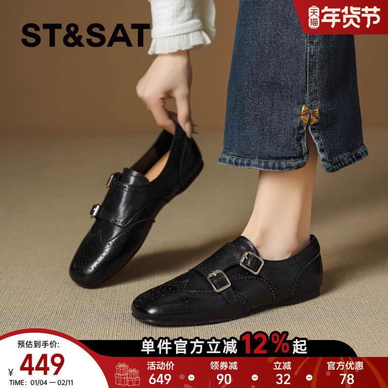 星期六2026年春季女款时尚浅口单鞋复古流行平底方头英伦风乐福鞋