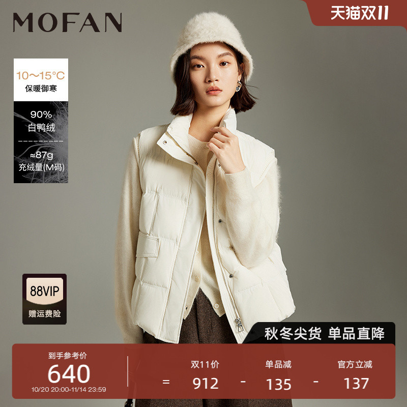 时髦立领90白鸭绒羽绒背心女MOFAN摩凡2025冬款白色羽绒马甲上衣