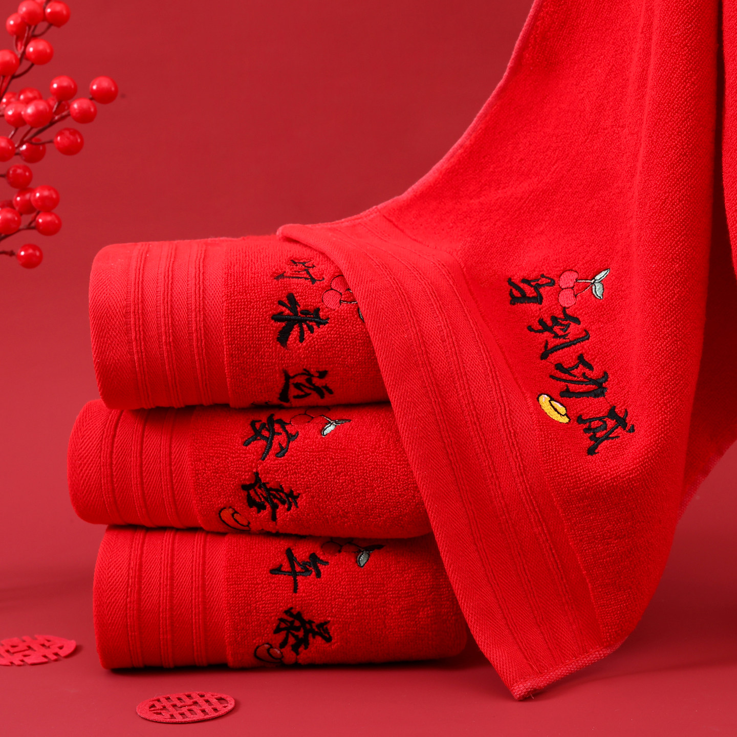 三利结婚毛巾纯棉一对红色喜字礼盒装陪嫁洗脸用品回礼高档伴手礼