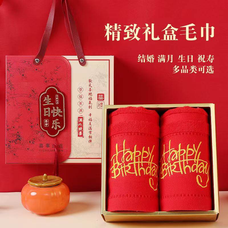 纯棉中式喜字结婚寿字红毛巾礼盒装回礼婚庆伴手礼全棉强吸水面巾