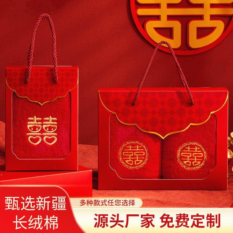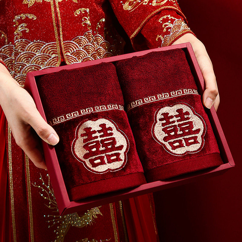 毛巾结婚红色婚庆纯棉一对陪嫁毛巾礼盒装喜字新婚毛巾回礼伴手礼