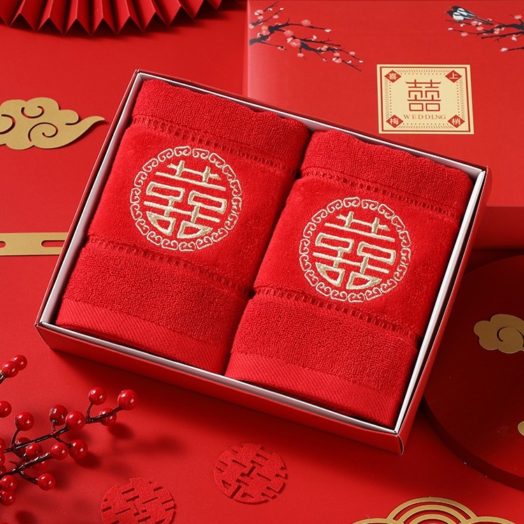 结婚毛巾红色婚庆纯棉一对陪嫁毛巾礼盒装喜字新婚毛巾回礼伴手礼