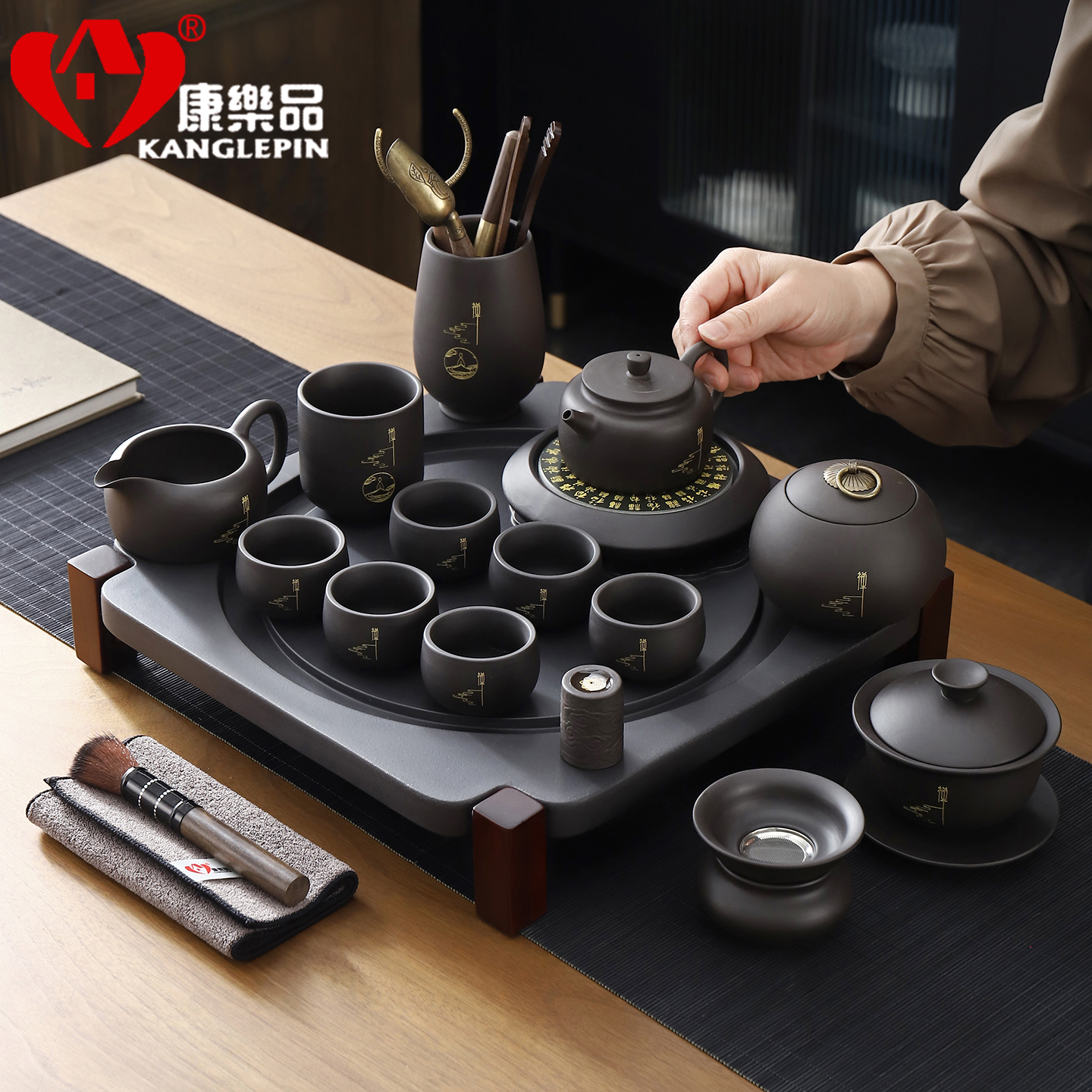 康乐品茶具套装2025新款 茶具用品紫砂茶盘客厅办公旋转茶壶整套