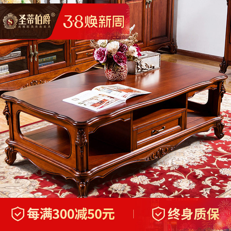 美式茶几实木客厅茶桌家用复古长方形茶台欧式储物收纳抽屉小户型