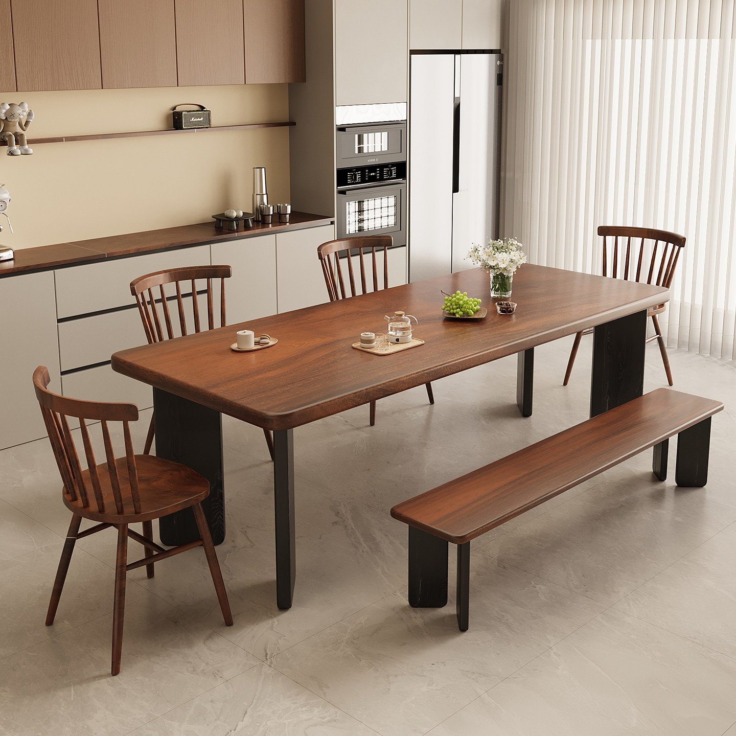 实木餐桌家用长方形书桌胡桃色轻奢极简高级感洽谈茶桌广岛椅组合