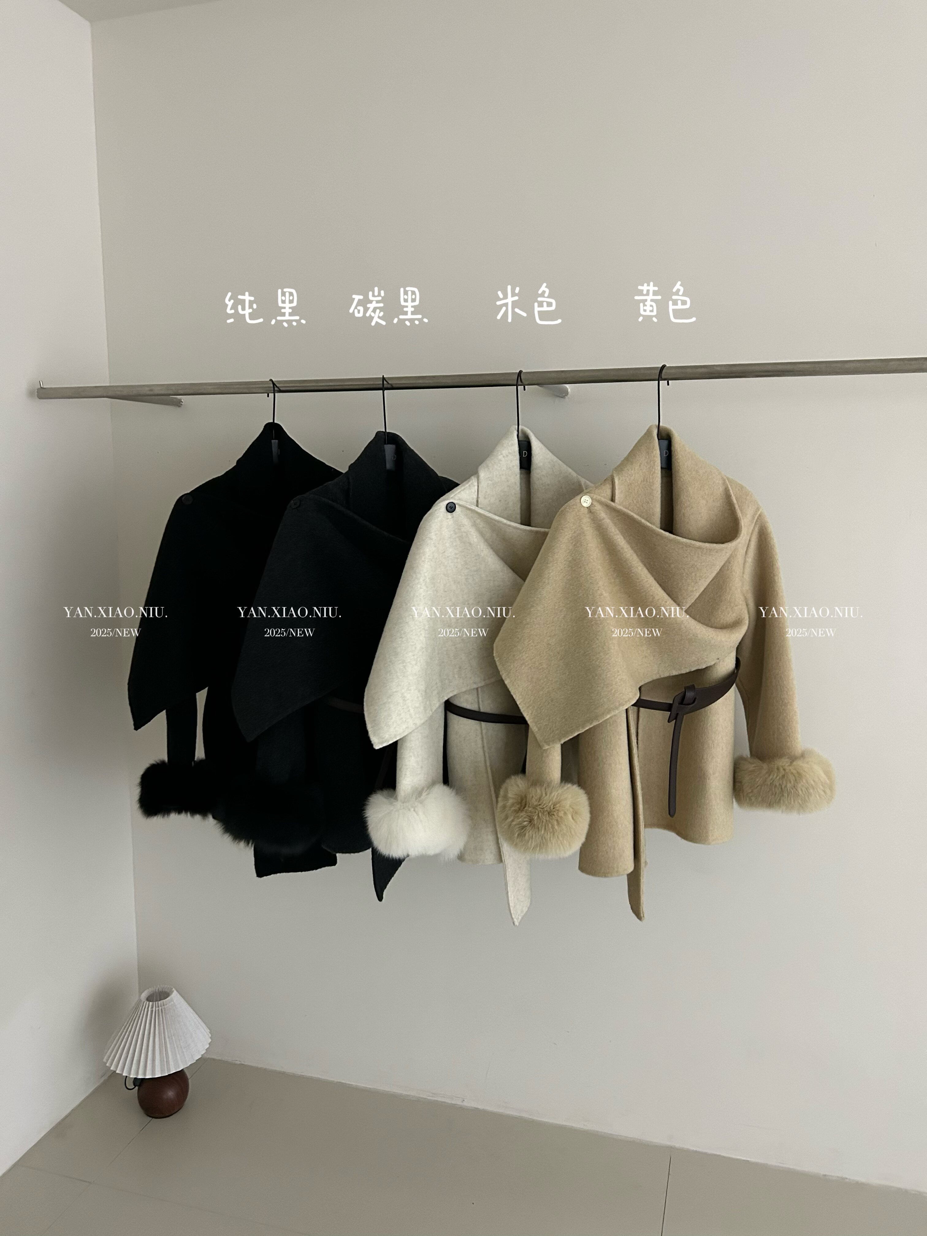 2025年冬季加厚狐狸毛流苏披肩双面羊毛大衣高端斗篷羊毛呢外套女