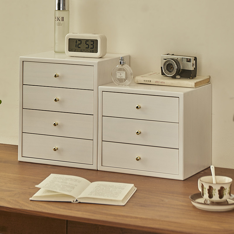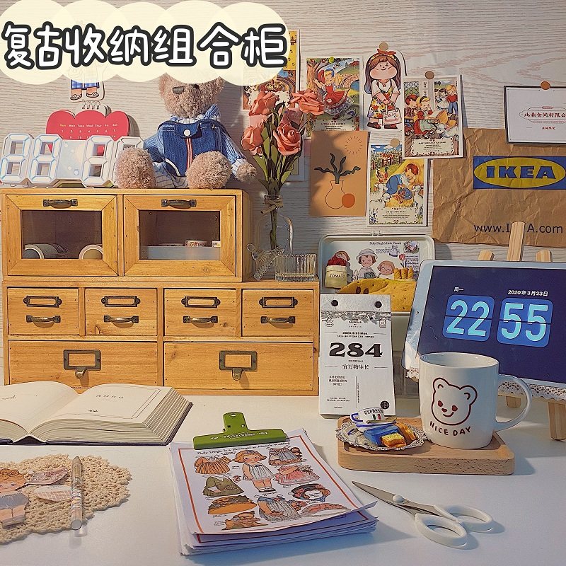 zakka实木覆古桌面收纳箱学生宿舍收纳盒四抽屉柜木质首饰置物架
