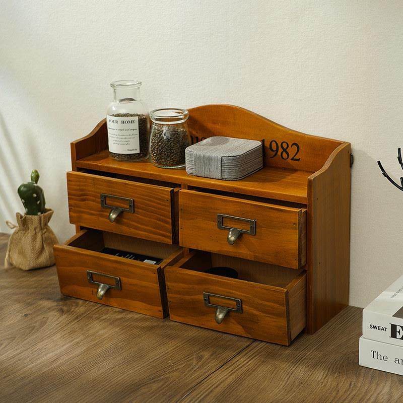 zakka实木复古桌面储物箱学生宿舍收纳盒四抽屉柜木质首饰置物架