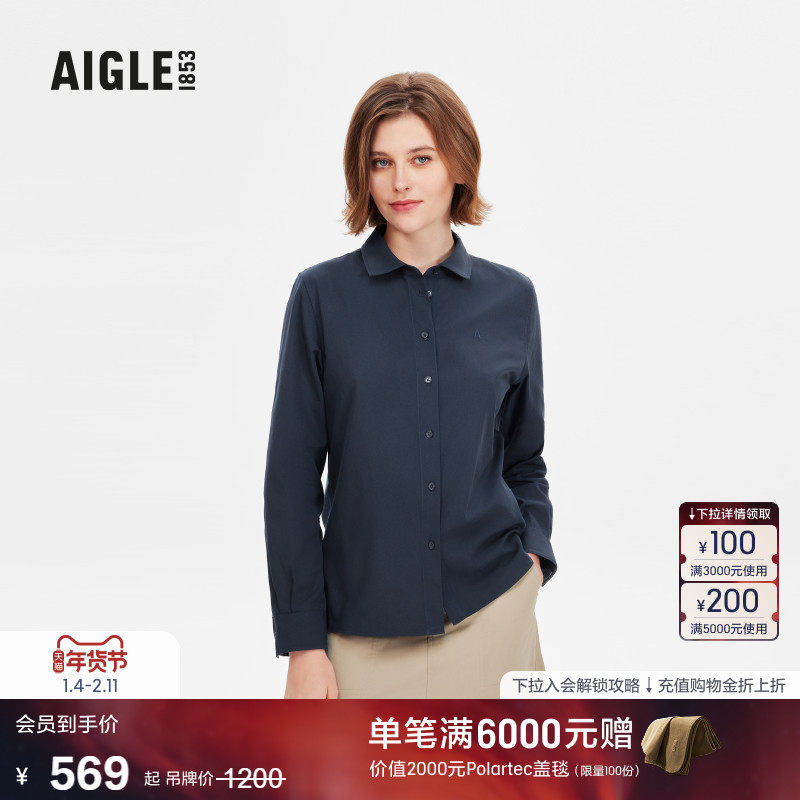 AIGLE艾高春秋季户外休闲简约时尚纯色长袖防晒衬衫法式上衣女款