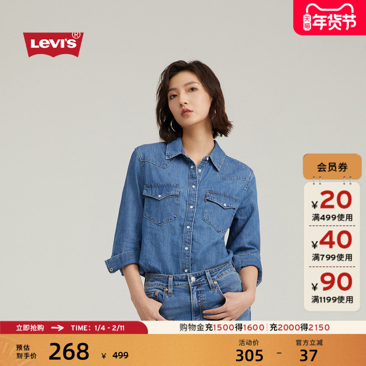Levi's李维斯女士美式经典翻领时尚宽松简约舒适蓝色长袖牛仔衬衫