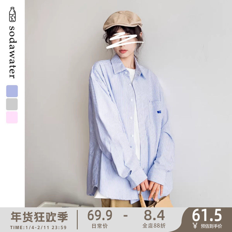 苏打汽水工作室春季男女款蓝色条纹衬衫日系青春时尚休闲长袖衬衣