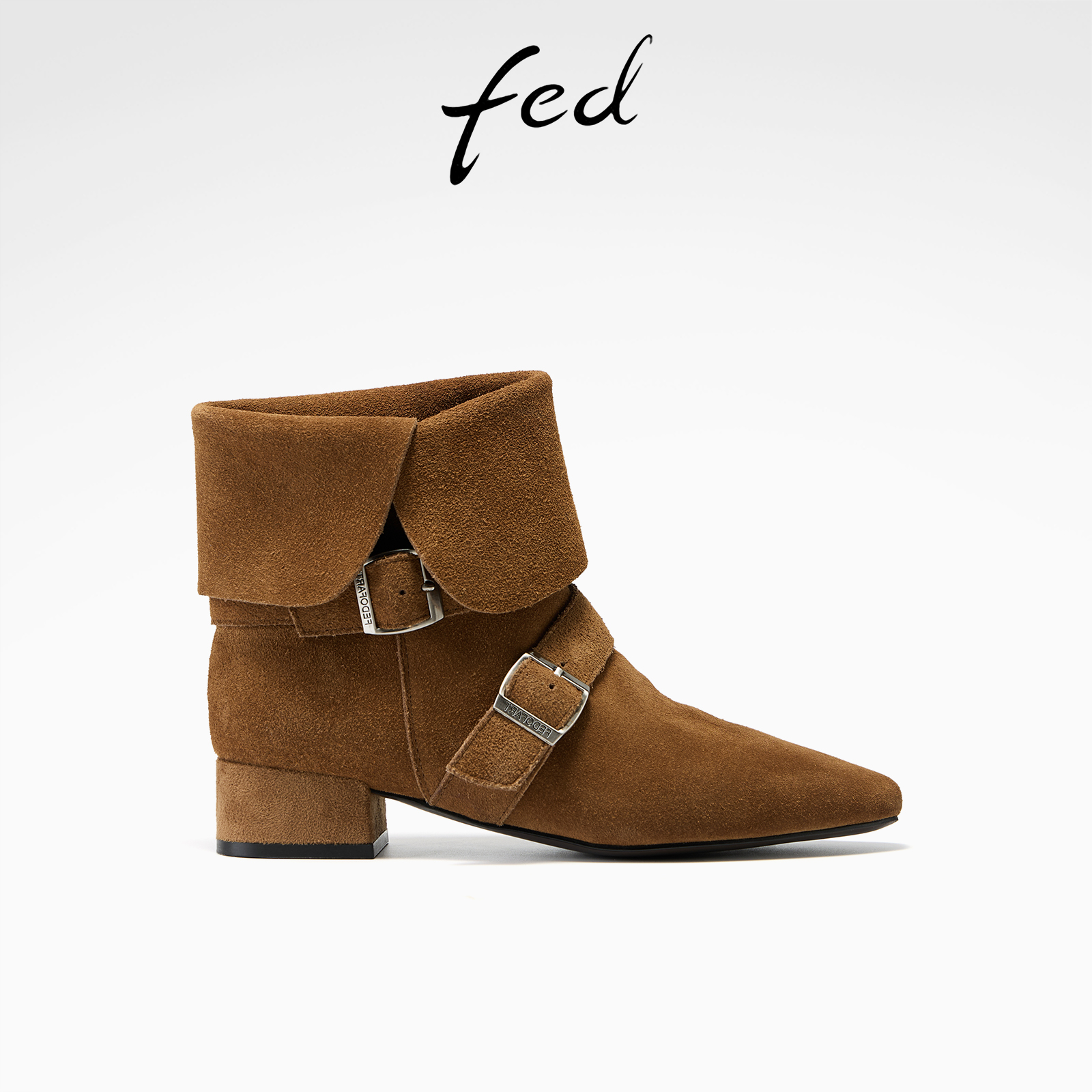 fed粗跟短靴春季新款女靴气质堆堆靴绒面西部靴女款D1116-ZFA268