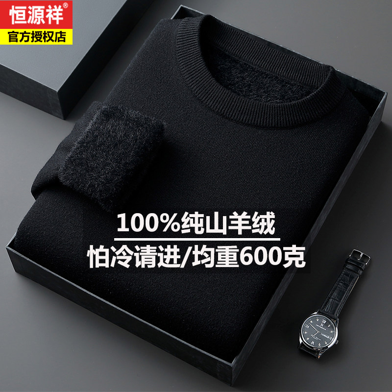 恒源祥男士100%山羊绒衫加绒特加厚圆领毛衣冬季高端一体绒羊毛衫