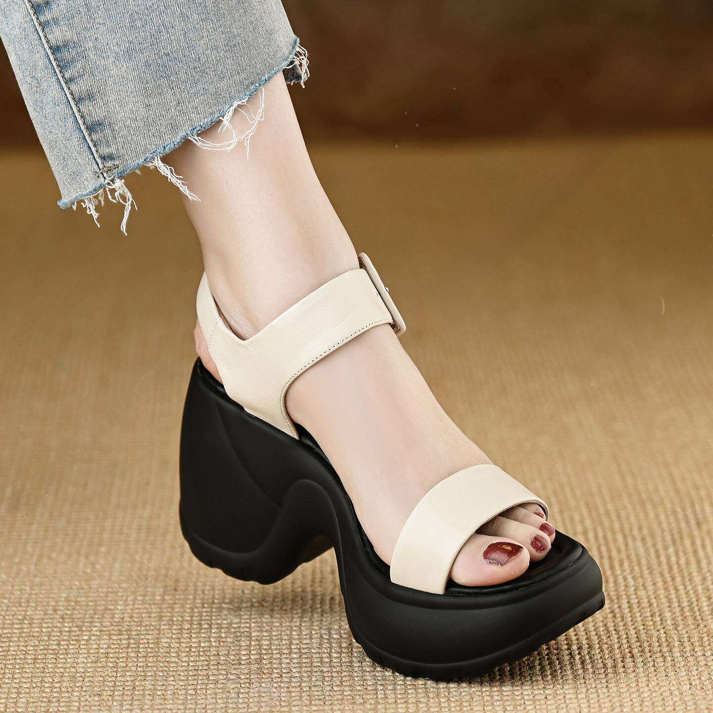皮厚先生 超高跟坡跟凉鞋女米白色 2025夏季新款编织防水台罗马鞋