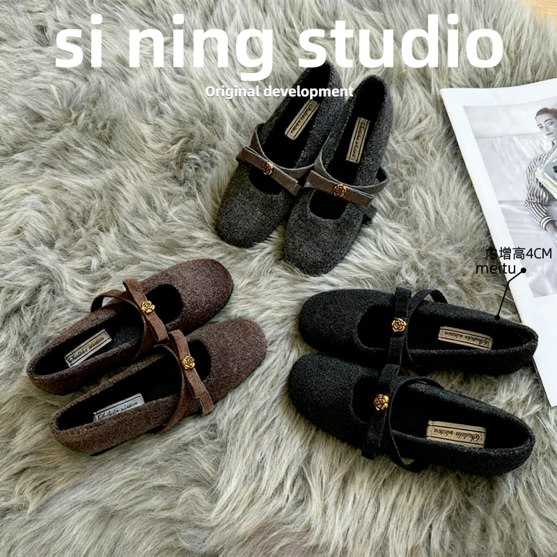 【王小毒】毛呢玛丽珍●3.5cm内增高毛毛鞋女保暖魔术贴芭蕾单鞋