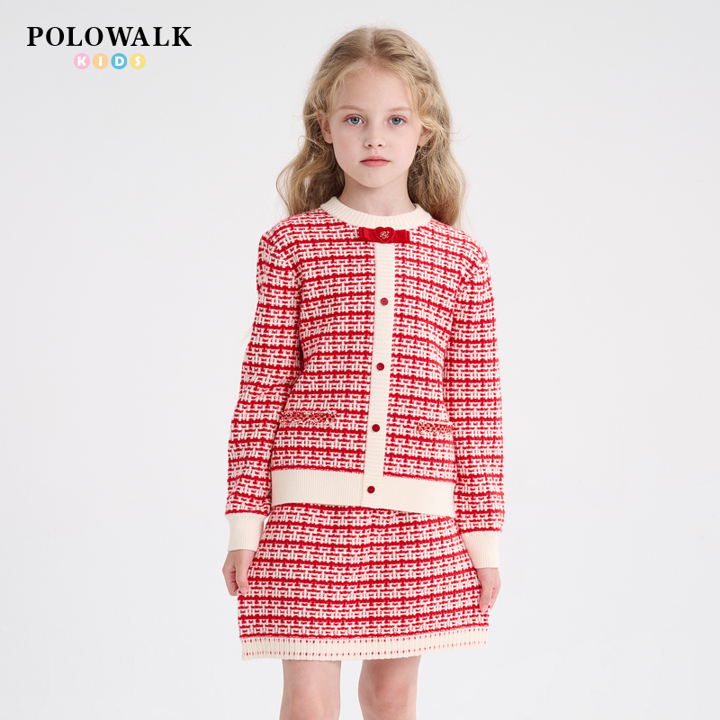 POLOWALK童装女童小香风针织套装秋冬新款保罗新年红毛衣开衫短裙