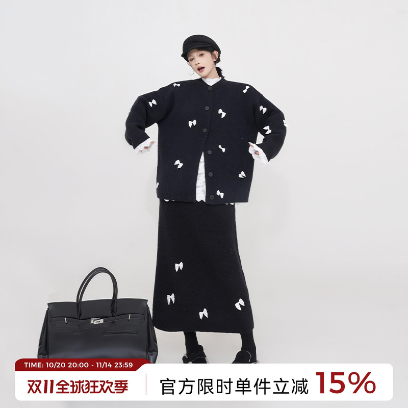 吴童童 蝴蝶结圆领长袖毛衣外套女秋冬韩系宽松针织开衫半裙套装